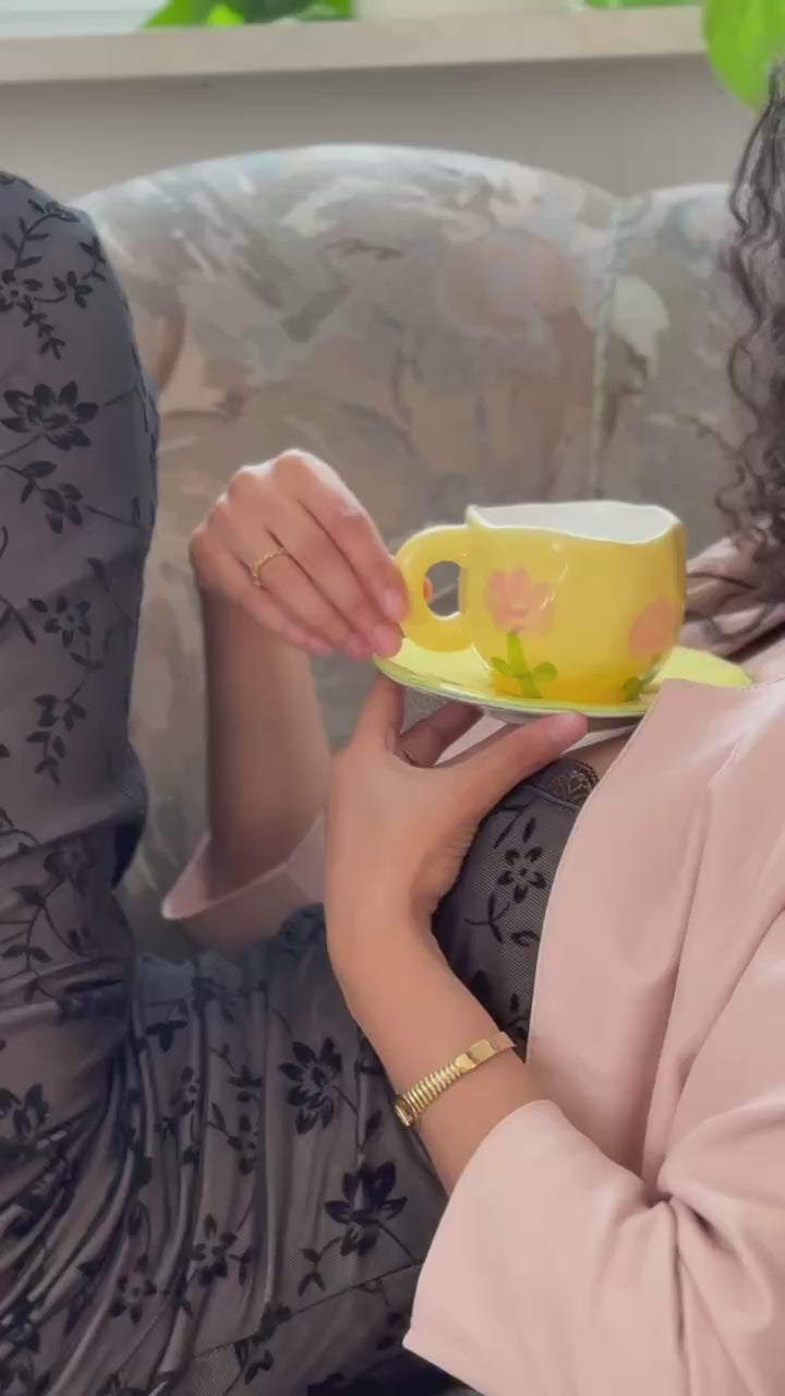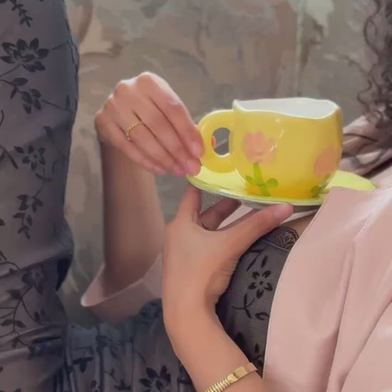 Bring springtime charm to your home with the cutest cup and saucer in this delicate tulip flower design. Hand-painted and crafted with love, this cute tulip flower mug piece is a beautiful choice for those who adore tulip flowers and pretty cups and saucers together